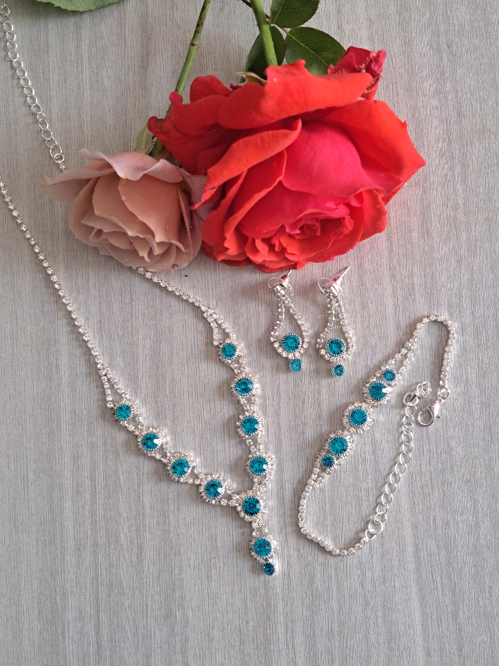 This three-piece collection features a necklace, bracelet, and matching earrings, each designed with vivid blue crystal-style stones framed in shimmering silver-tone detail.